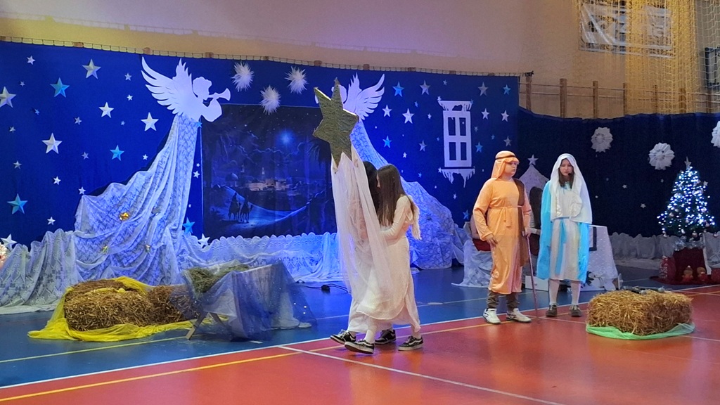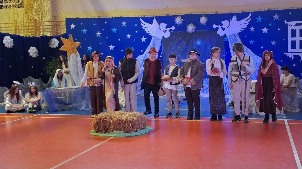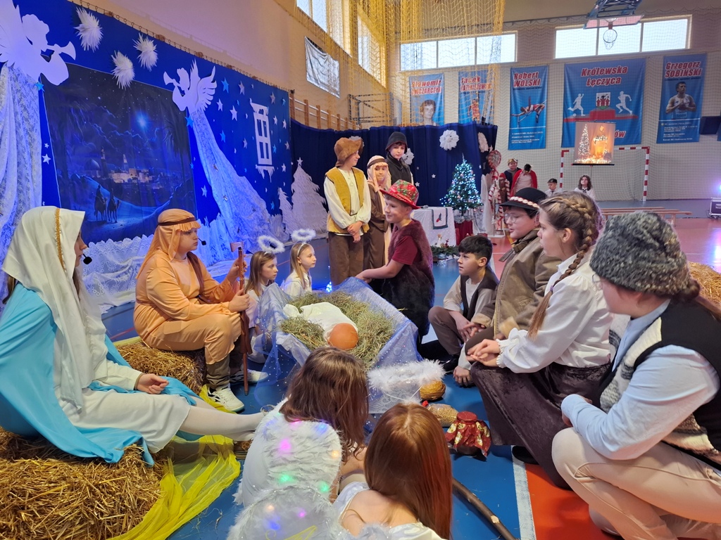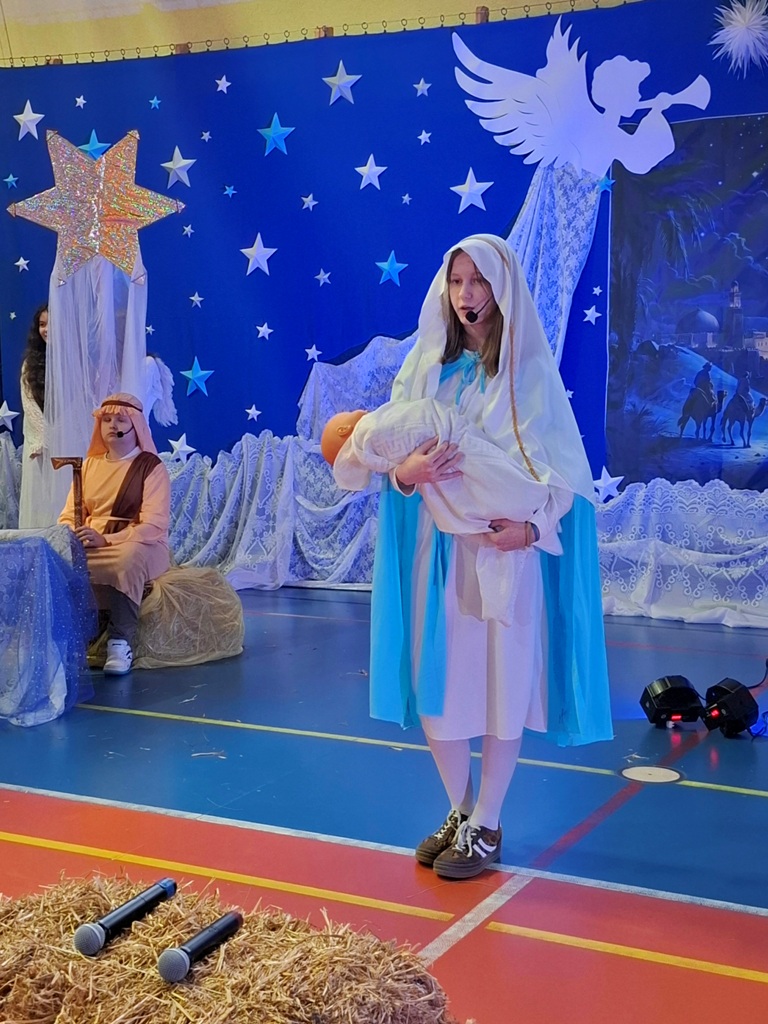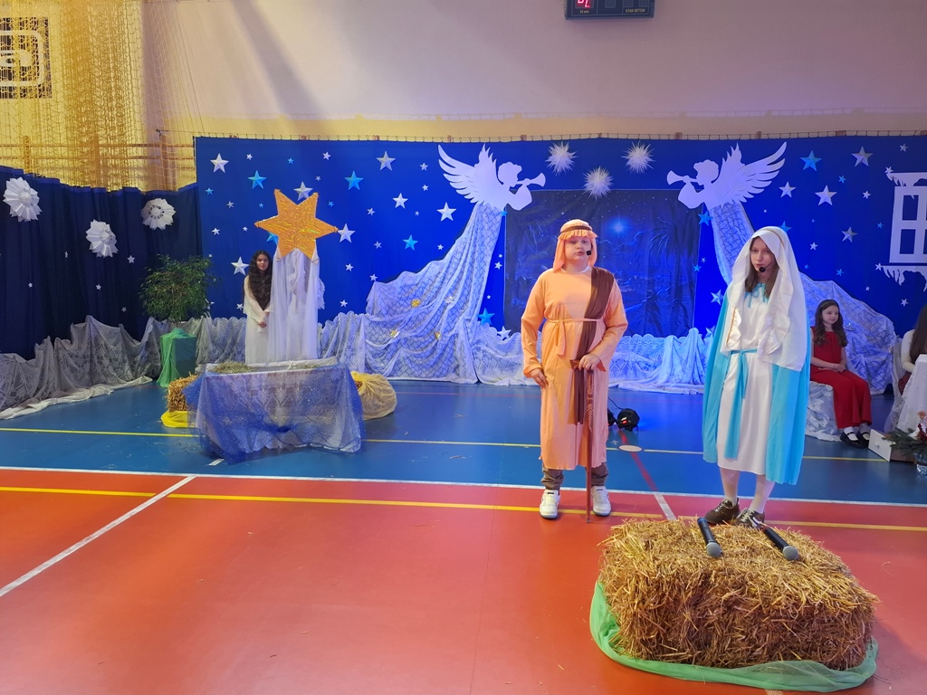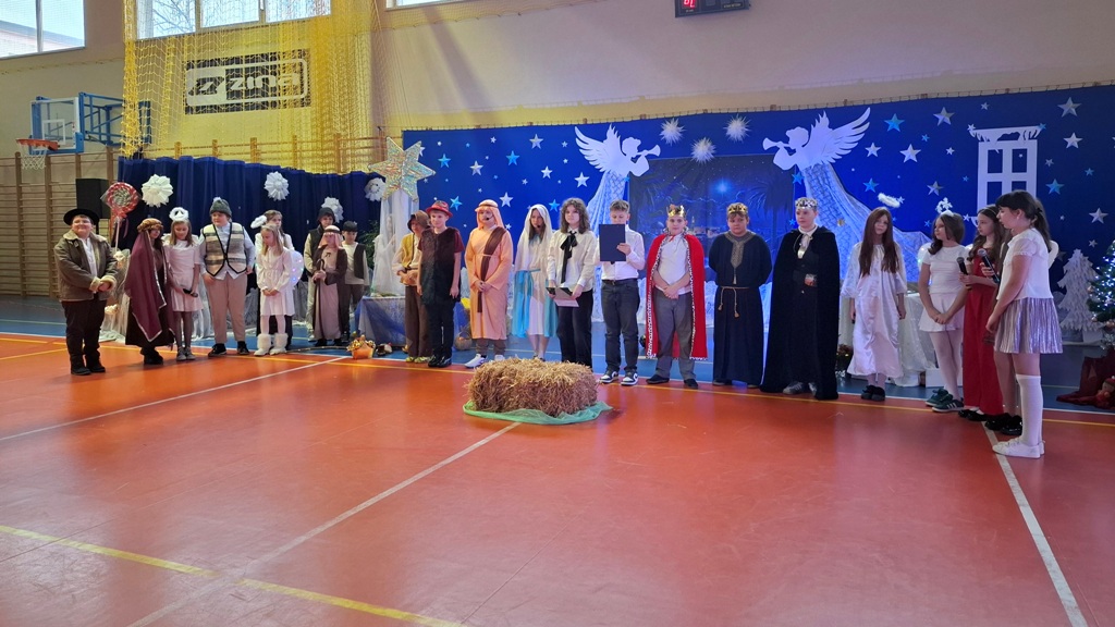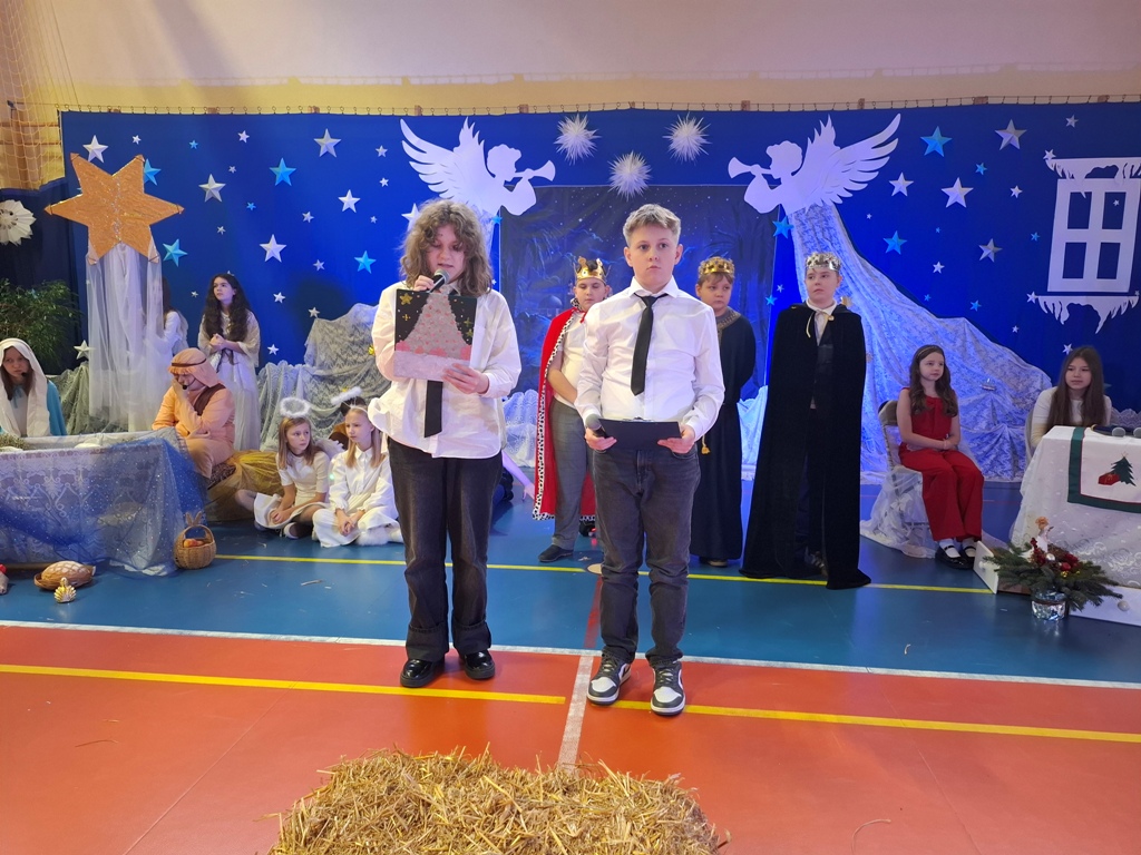 "Historia cudownej nocy" - przedstawienie jasełkowe w wykonaniu wszystkich uczniów klasy 5a wprowadziło całą społeczność naszej szkoły w świąteczny nastrój.