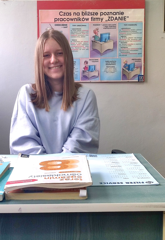 Zuzanna, swoją pracowitością, systematycznością oraz wrażliwością udowodniła, że zawiłości języka polskiego nie są jej obce. Nasza zdolna uczennica, w kolejnych etapach zmagań polonistycznych, doskonale poradziła sobie z gramatyką języka polskiego, znajomością wybranych utworów z literatury ojczystej oraz klasyki literatury światowej. Wykazała się również wspaniałą sprawnością językową w formach wypowiedzi pisemnej. Ósmoklasistka jest również laureatką konkursów recytatorskich oraz literackich, zarówno na szczeblu międzyszkolnym jak i powiatowym.